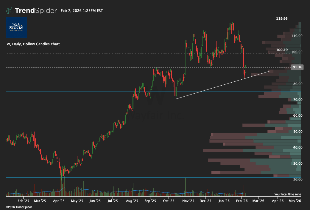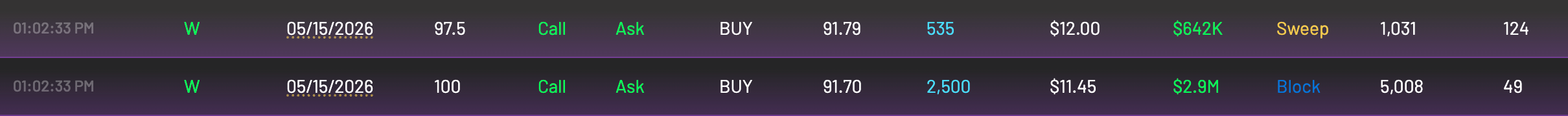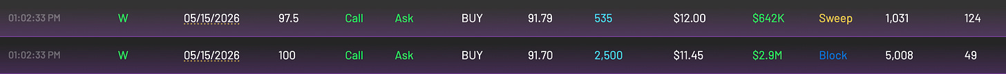In addition to the support found at 84-87, W also saw unusual May option activity targeting the $100 area while trading around $91.75.