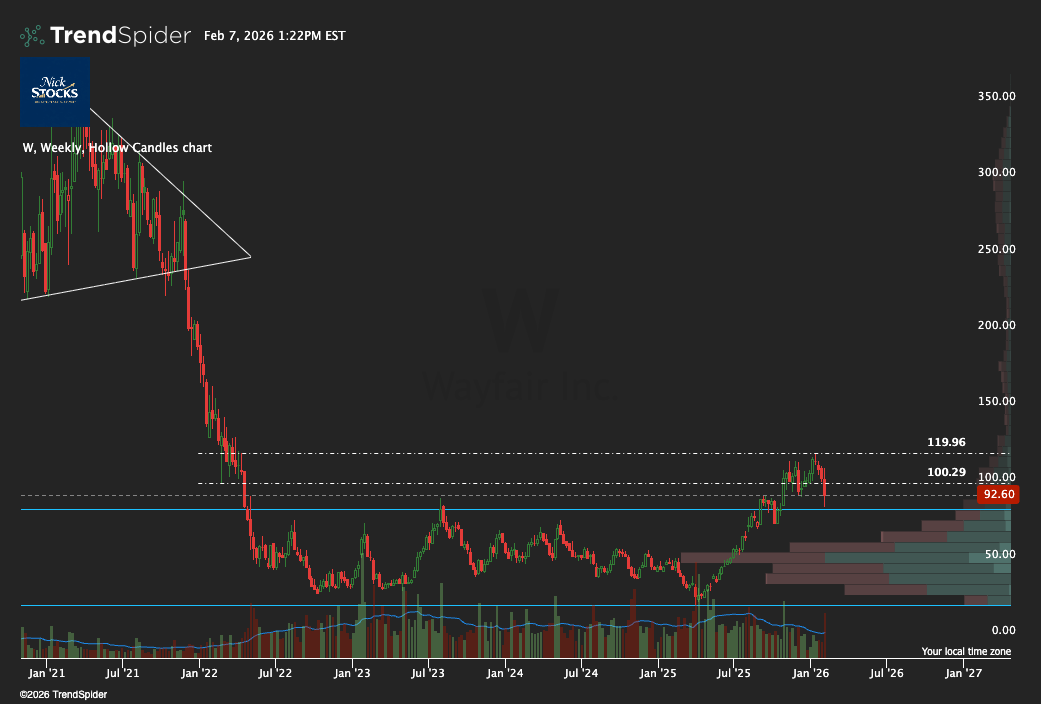 The weekly chart, shared below, shows that W is backtesting the highs of a previous 3.5-year consolidation and accumulation.